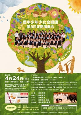 プログラム ■信長貴富作品集 ・未来へ ■北越戯譜 〜越後の遊び歌〜 作曲:柴田南雄 ■ジュニア(〜小6) ・風のとおりみち ■シニア(小6〜) ・Ave Maria 曲:Josquin des Prez ■豊中混声合唱団と共に 童声合唱、混声合唱とピアノのための「葉っぱのフレディ」 きこえてくる 詩:まど・みちお 曲:萩京子 委嘱初演 |