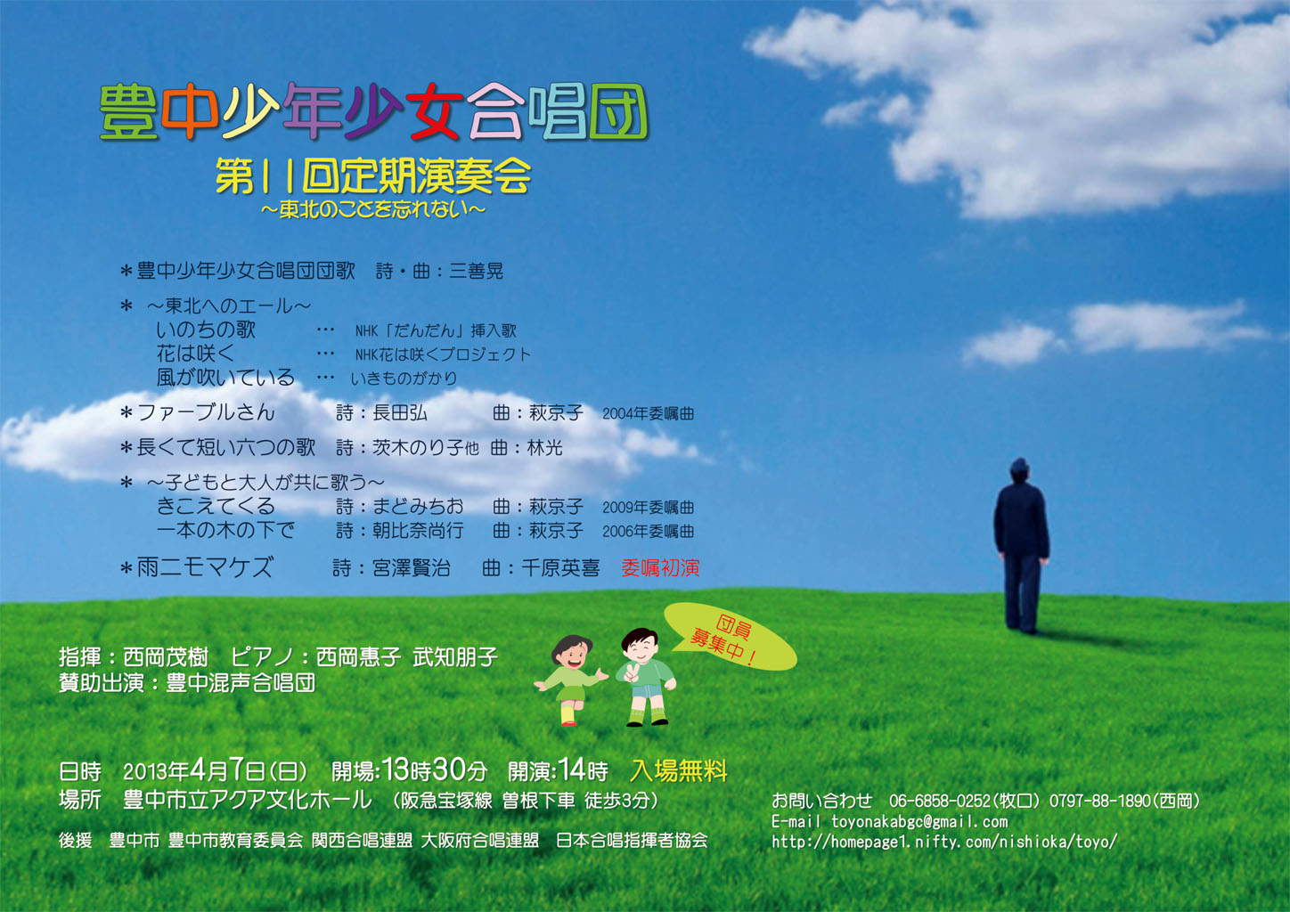 豊中少年少女合唱団は、来る4月7日(日)に豊中市アクア文化ホールにて、 第11回定期演奏会を開催する運びとなりました。 創団12年の、まだまだ未熟な合唱団ですが、お客様に合唱の喜びと楽しさをプレゼントできるよう、一生懸命、練習を積み重ねています。 今年のセールスポイントは、千原英喜さんに新たに編曲していただいた宮澤賢治の「雨ニモマケズ」です。東北大震災以降、賢治の生き方や言葉が、あらためて見直されていると思います。その賢治の宝石のような言葉が、千原先生の手により感動的な音楽になっています。 他にも、豊少が萩京子さんに委嘱した「ファーブルさん」や、林光さんの「長くて短い六つの歌」など、私たちの大好きな曲が勢ぞろいしています。大人の合唱団である豊中混声合唱団にも賛助出演していただきます。 ご多忙のこととは思いますが、何卒、お運びいただきたご案内いたします。